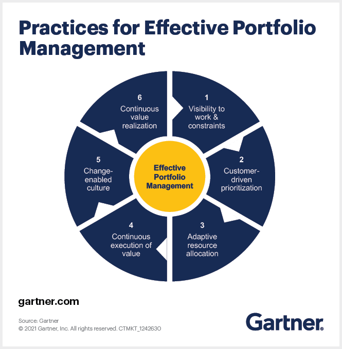 Kortom, er moet meer gebeuren met minder. Welke impact heeft dat op de aanbevolen op zes best practices voor effectief portfoliomanagement zoals Gartner die publiceerde?