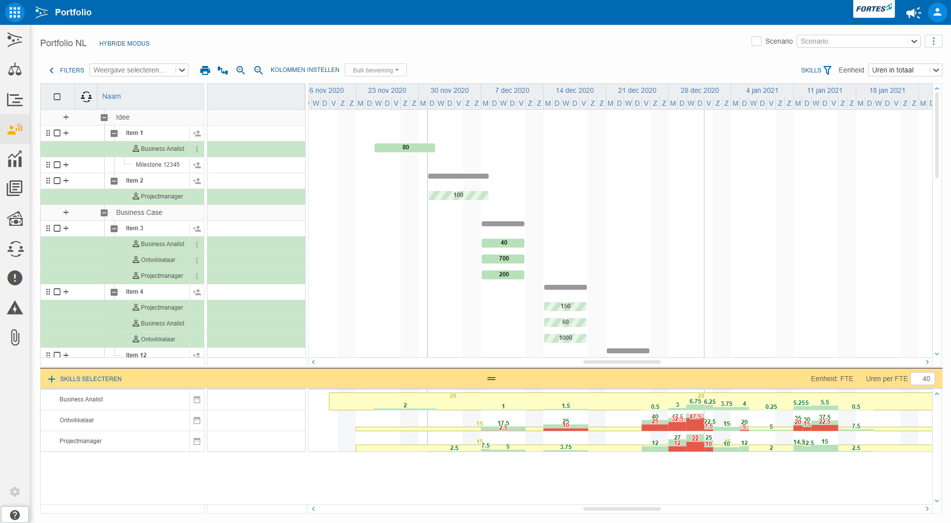 Create a realistic portfolio planning by matching the need for skills and resources in projects with the total availability. Bottlenecks are immediately visible with a red color and can be easily resolved by adjusting the planning of the relevant initiatives. It is also possible to create different scenarios for quick decision-making.